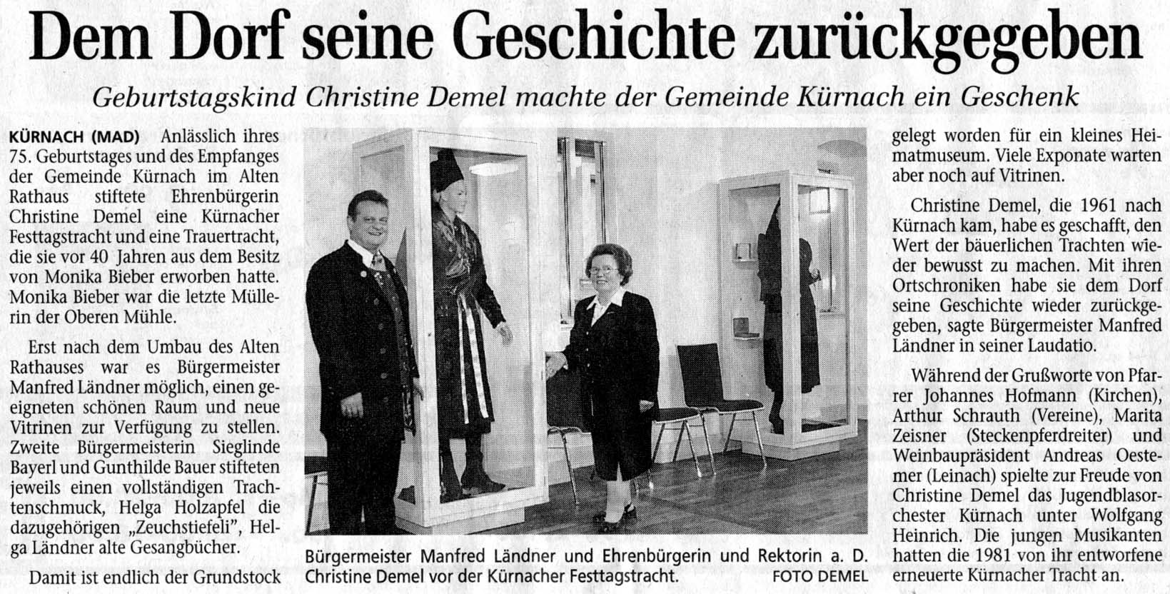 Gemeinde Kürnach mit 1. Bürgermeister Thomas Eberth * Die Mitarbeiter der Gemeinde und des Schulverbandes * Partnerschaftskomitee Kürnach-Aljezur * Die Landfrauen * Kameraden-Soldatenverein Kürnach e.V. * Kath. Deutscher Frauenbund Zweigverein Kürnach * Sportschützenverein Kürnach e.V. * Burkard Strauß * Altbürgermeister und Ehrenbürger Otto Habermann * Gruppe Aktiv 50 Plus * Gesangverein Eintracht Kürnach * Freiwillige Feuerwehr Kürnach * Evang. Luth. Kindergarten St. Markus * Schautanzgruppe e.V. Kürnach * Jugendblasorchester Kürnachtal e.V. * Familie Carla Kuhn * Seniorenclub Kürnach * Siedler Gemeinschaft Kürnach e.V. * Volksschule-Verbandsschule Kürnach-Prosselsheim * Tennisclub Kürnach * Kerstin Celina * Steckenpferdreiter Kürnach * Altbürgermeister Helmut Eichelbrönner, Püssensheim * Junge Union Kürnach * Sportverein Kürnach * Jägerschaft Kürnach * CSU Ortsverband Kürnach * MdL Manfred Ländner * Bund Naturschutz e.V Bayern * Christa Huber * FeldgeschworeneKürnach * Hedwig Heinrich * Otto Rüger * Hans Stegerwald, Güntersleben * SPD Ortsverein Kürnach * Helene Schubert, Lengfeld * Reinold u. Gudrun Falge, Haard * Willi, Wolfgang, Renate und Matthias Demel * Dott. Mariolina Misomalo/Vicenza (Italien) *